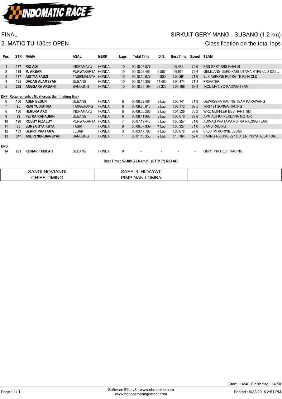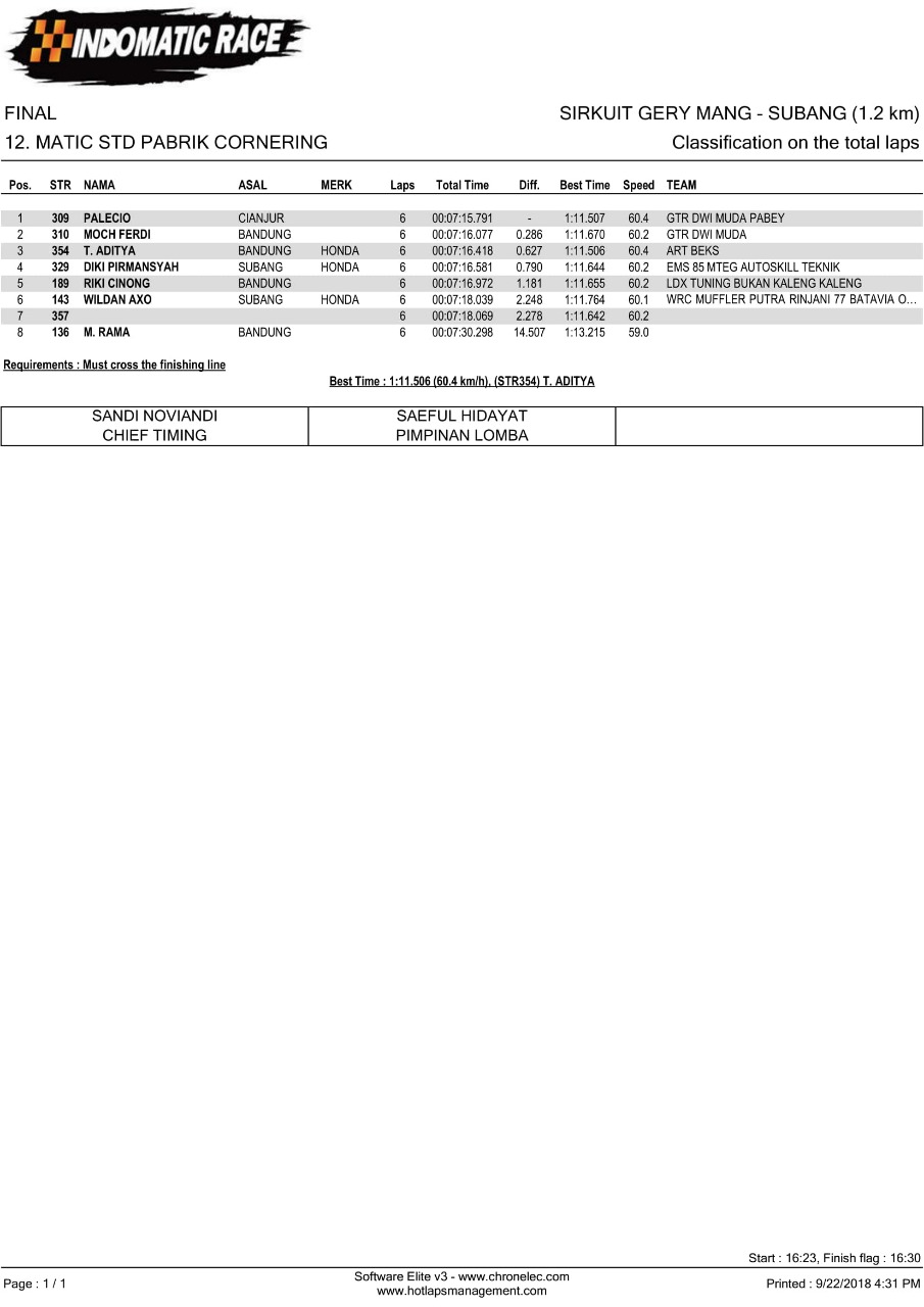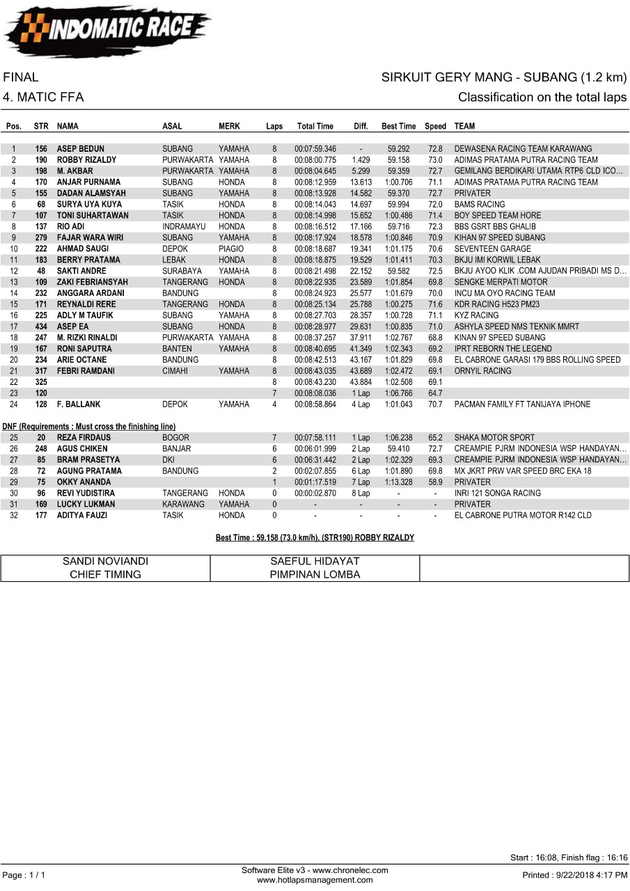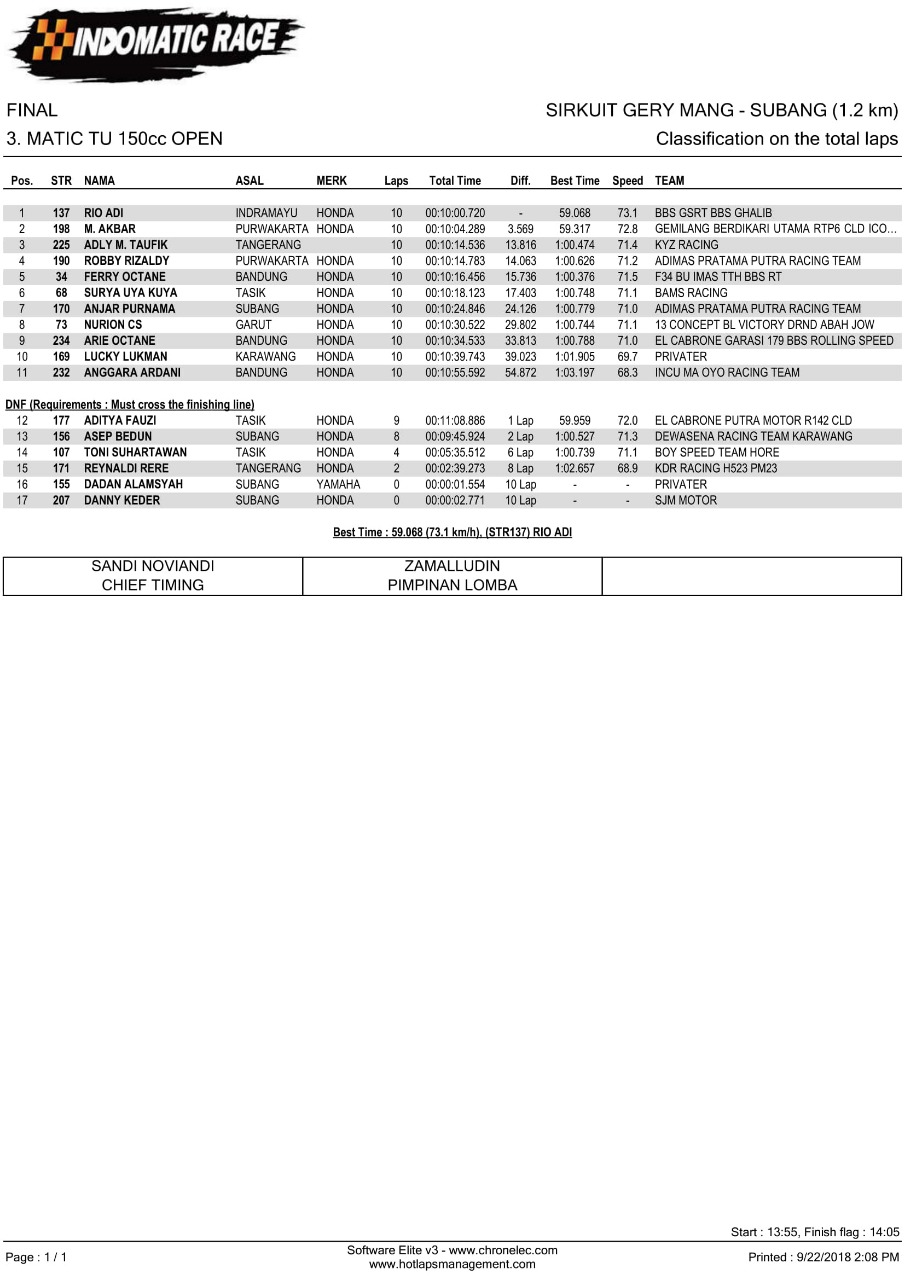 Nih hasil lomba Indomatic Race, Sabtu (22/9/2018). (Arif/nm)