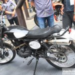 Sementara Hendra dari Hthree Custom Garage tampil cukup radikal dengan gaya cafe racer serta pengecatan tidak biasa yakni warna oranye candy serta sentuhan airbrush. Beberapa komponen bodinya menggunakan bahan kuningan seperti handgrip dan footstep. Ia juga menjejalkan suspensi ohlins di belakangnya. “Kita tidak membuat kit khusus, berdasarkan pesanan saja, maunya apa, kita bikinin,” tukas Hendra.