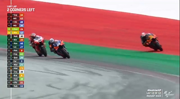 Karena sebelumnya pada hari itu, Pembalap KTM Moto2, Jorge Martin sebenarnya finis terdepan. Namun, di tempat yang sama ia melebar keluar trek. Akibatnya, steward memberikan kemenangan Marco Bezzecchi- Sky Racing VR46.