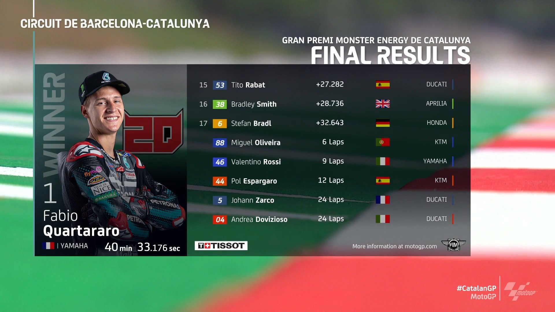 | 1 | 25 | 20 | Fabio QUARTARARO | FRA | Petronas Yamaha SRT | Yamaha | 164.3 | 40’33.176 |