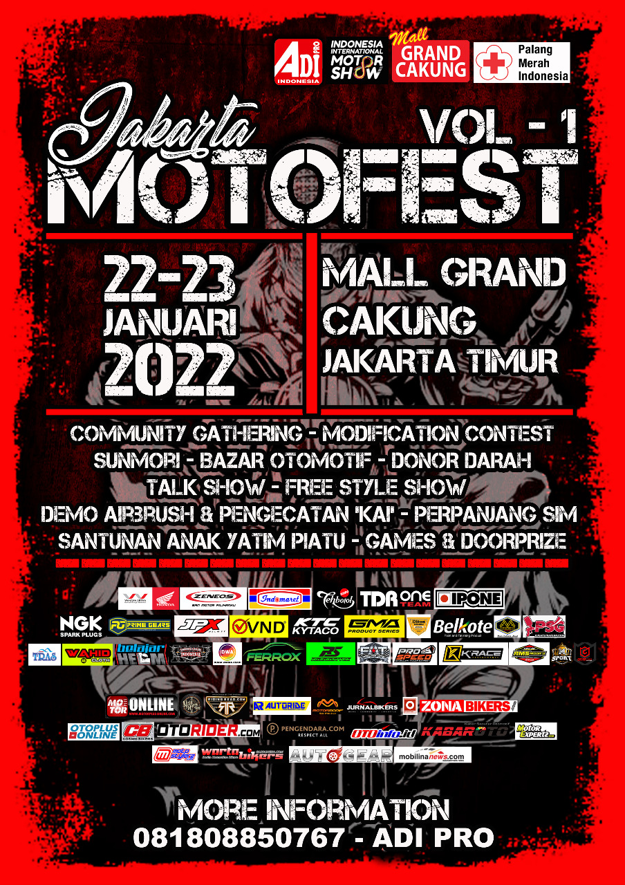 AdiPro telah menyatukan pecinta otomotif Indonesia di event 2 hari weekend itu. Para pecinta modifikasi sepeda motor dan modifikator serta bengkel ubahan/modif saling ‘adu’ kreativitas di Mall Grand Cakung, Jakarta Timur. Selama 2 hari dari tanggal 22-23 Januari 2022 gelaran Jakarta Motofest Volume 1 menampilkan agenda sangat padat. Di antaranya, motorcycle modification, live airbrush, freestyle show, sunmori, bazaar otomotif, talkshow, donor darah, perpanjangan SIM, santunan anak yatim dan bersilaturahim, kumpul komunitas motor Jabodetabek, serta ada poles helm bayar suka suka dari Komunitas Belajar Helm.
