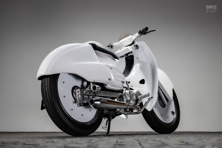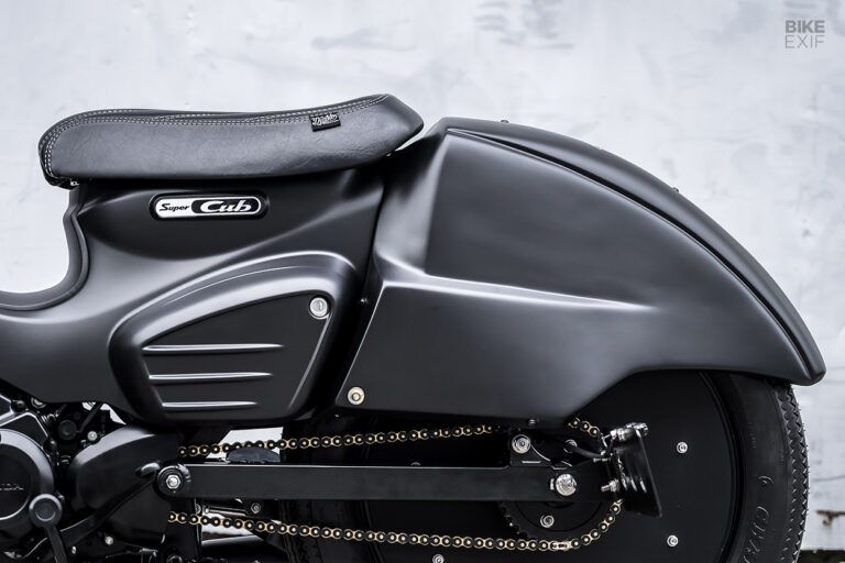 Selain itu, terdapat dudukan plat yang dipindahkan ke samping. Lampu yang LED yang dipasangkan untuk headlamp dan lampu sein yang tersemat pada fender, jok singleseat yang terpasang menambah kesan racing sebuah super cub. Ban 17” Sawtooth yang dipadukan dengan pelek piringan besar melihatkan bentuk yang sangat aerodinamis.