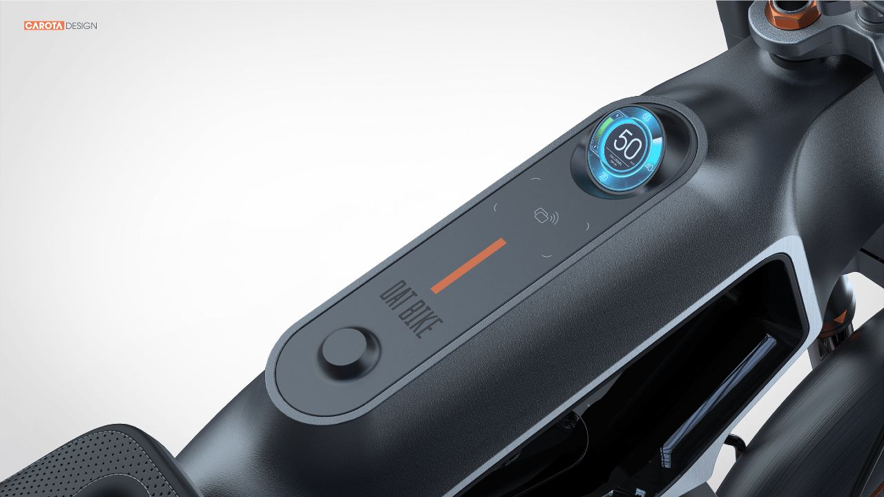 Tampilan minimalisnya dimulai dengan jok tipis, dasbor linier yang berada di pilar atas, dan bahkan sepasang lampu depan ramping, ditata secara vertikal. Garpu kembar di bagian depan, branding Carota di sepanjang bagian dasar.