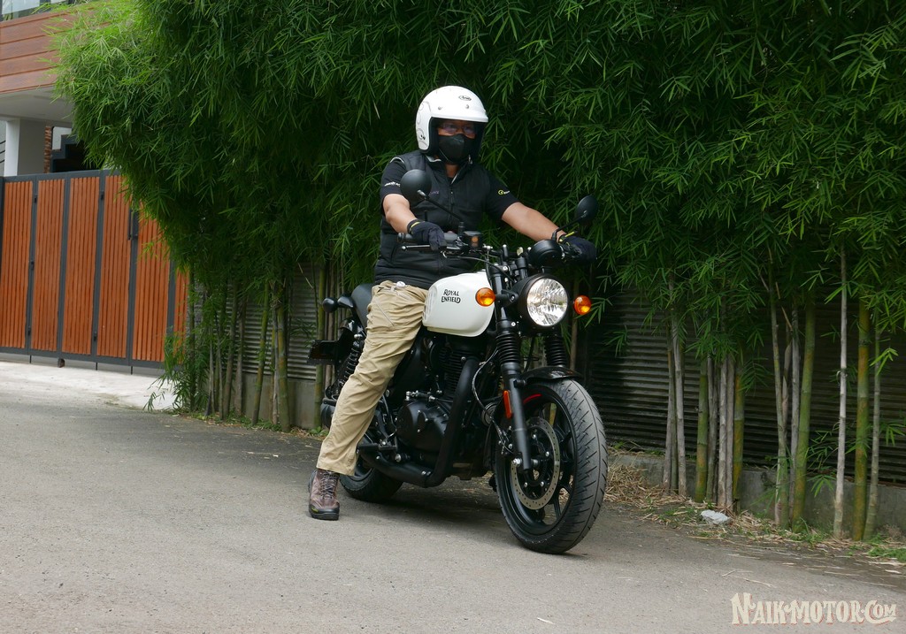 Tuas kontrol: gear shifter cukup pendek jadi terjangkau, demikian dengan tuas rem belakang. Hunter350 dilengkapi rem cakram di kedua roda dan sudah ABS 2 kanal, jadi pakem.