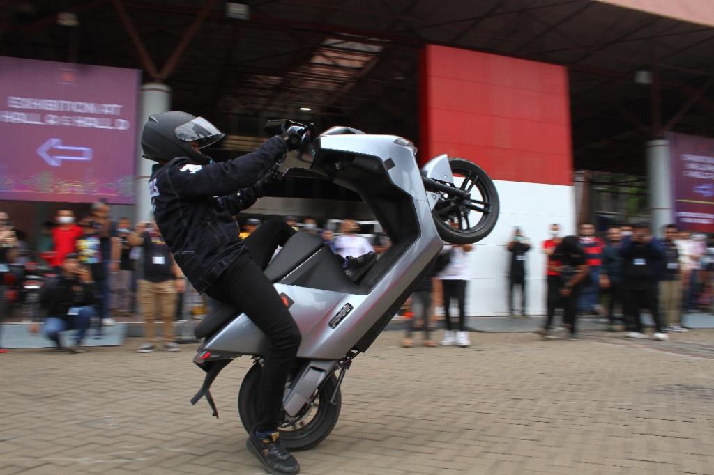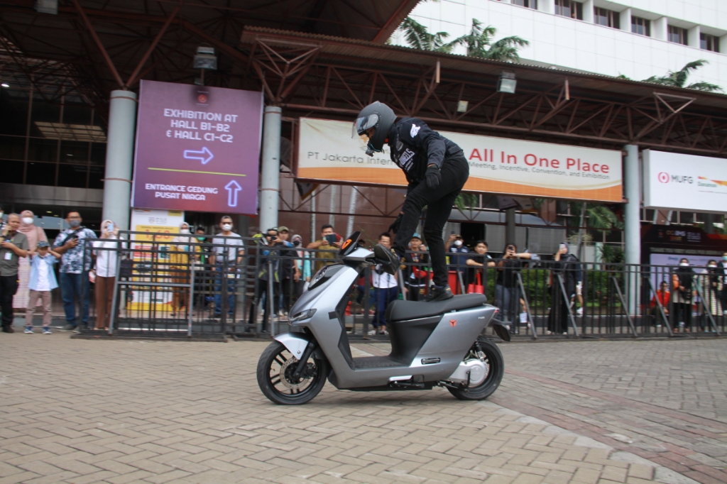 Acara freestyle motor listrik Yadea mempercayakan stunt rider profesional Tanah Air Revdy. Rancang performa, kaki-kaki, hingga sasis yang ada pada prototipe Yadea F200 mendukung atraksi sang stunter.