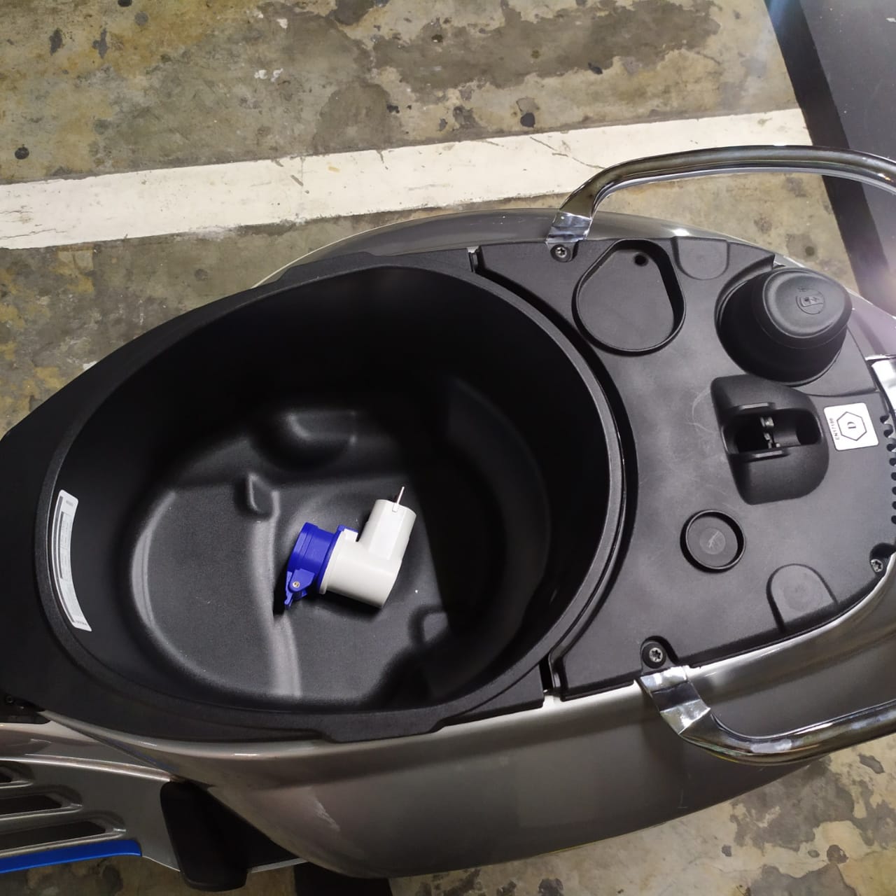 Tim naikmotor ketika pertama kali mencoba Vespa Elettrica melihat langsung proses pengisian daya skuter listrik ini. Terdapat kabel sepanjang 2 meter yang bisa digunakan untuk mengisi daya terletak di bawah jok. Soket kabel ini ini dilindungi penutup dan sudah ada fitur safety di mana ketika tidak tertutup dengan benar skuter ini tidak akan bisa berjalan.
