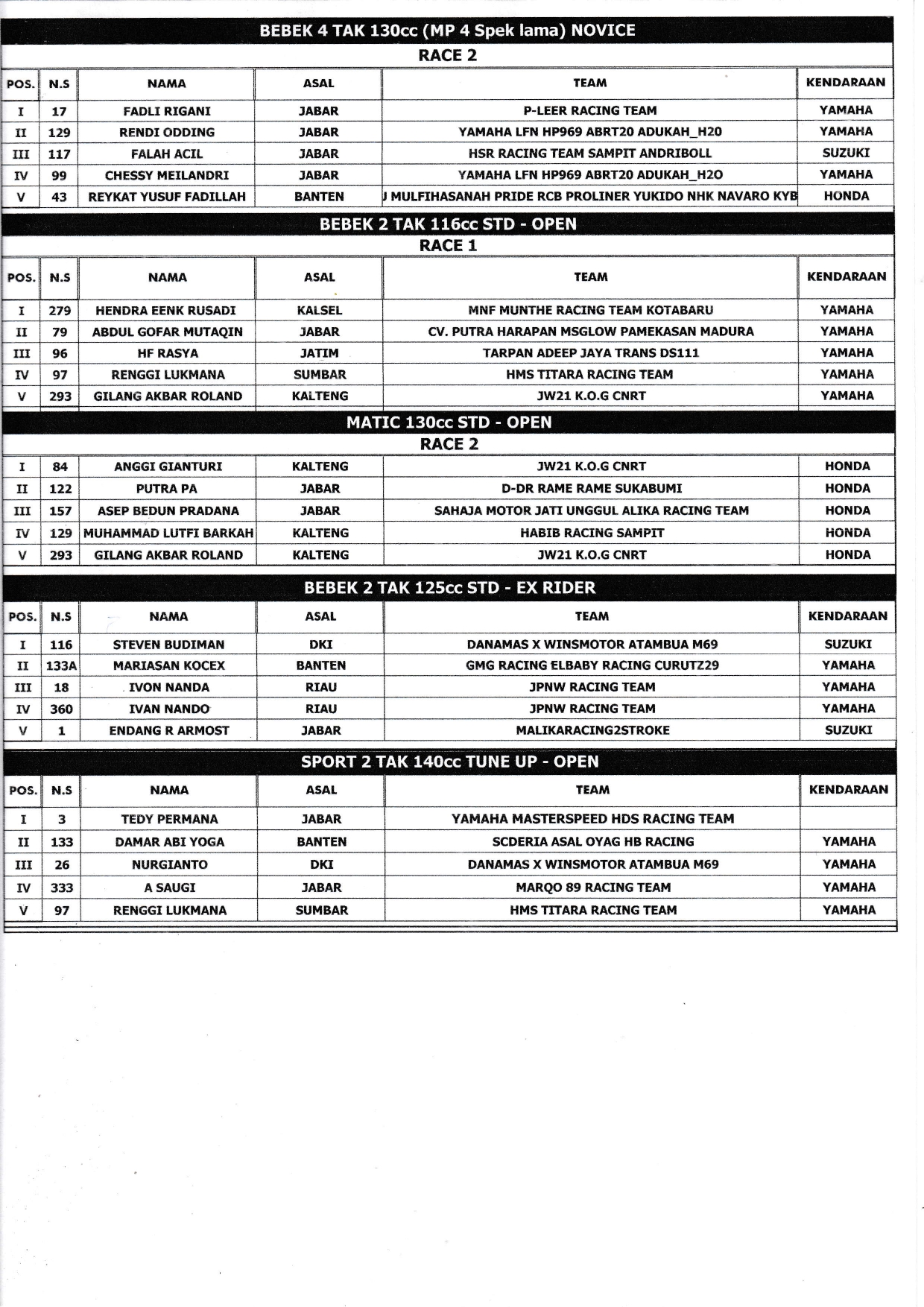 “Terima kasih untuk dukungan semuanya, orang tua saya yang datang dari Jogja, Pak Haji Putra untuk eventnya semoga bisa dilanjutkan di tahun berikutnya. Dan pada kesempatan ini saya pamit mundur dari balap bebek karena tahun depan saya ikut di Kejuaraan Dunia World Supersport 300 semoga bisa mengibarkan bendera mereha putih di balap internasional,” sebut Aldi yang tampil brilian di setiap race.