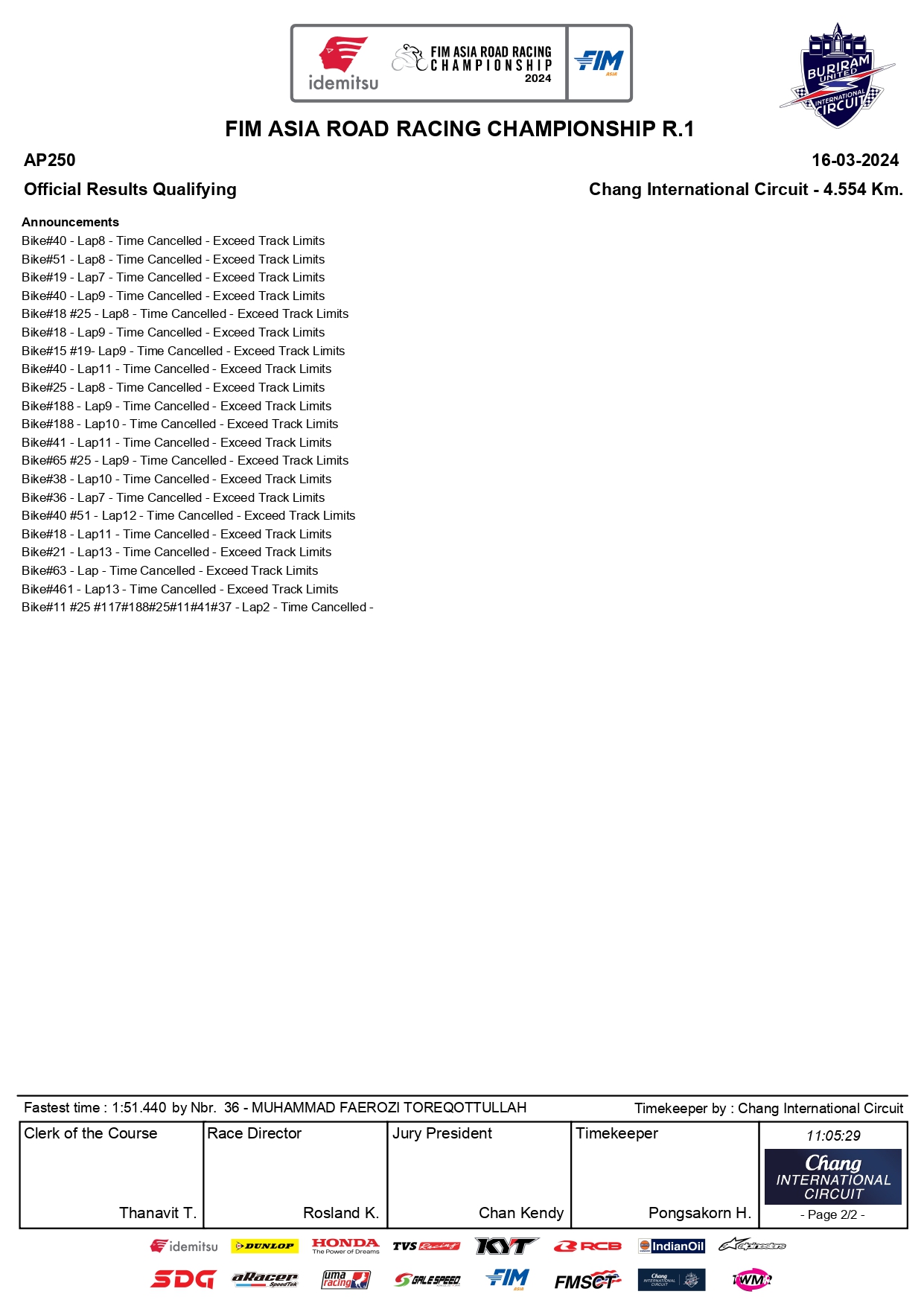 Pembalap Malaysia Farres Putra Mohd Fadhill (Cardinals Factory Racing Team ARRC) berada di urutan kedua disusul Fahmi Basam dari Yamaha LFN HP969 Indonesia Racing Team di urutan ketiga. “ Saya tidak bermain dengan strategi waktu kualifikasi karena waktu hanya 10 menit,”sebut Aditya.
