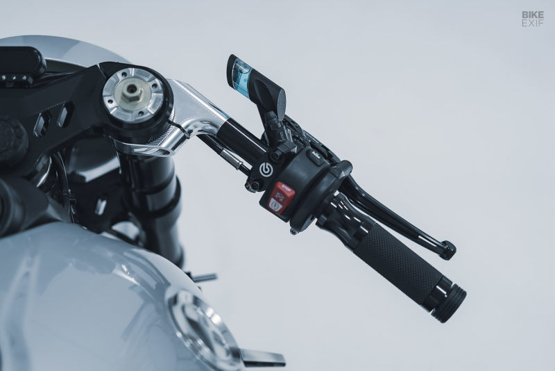 Area kokpit terdapat segitiga atas CNC dan setang model clip-on untuk mengejar konsep Cafe Racer, ada pula speedometer Motogadget. Kemudian untuk master rem dan master kopling menggunakan Brembo, tabung minyak rem uniknya terinspirasi dari Vision DC milik BMW.