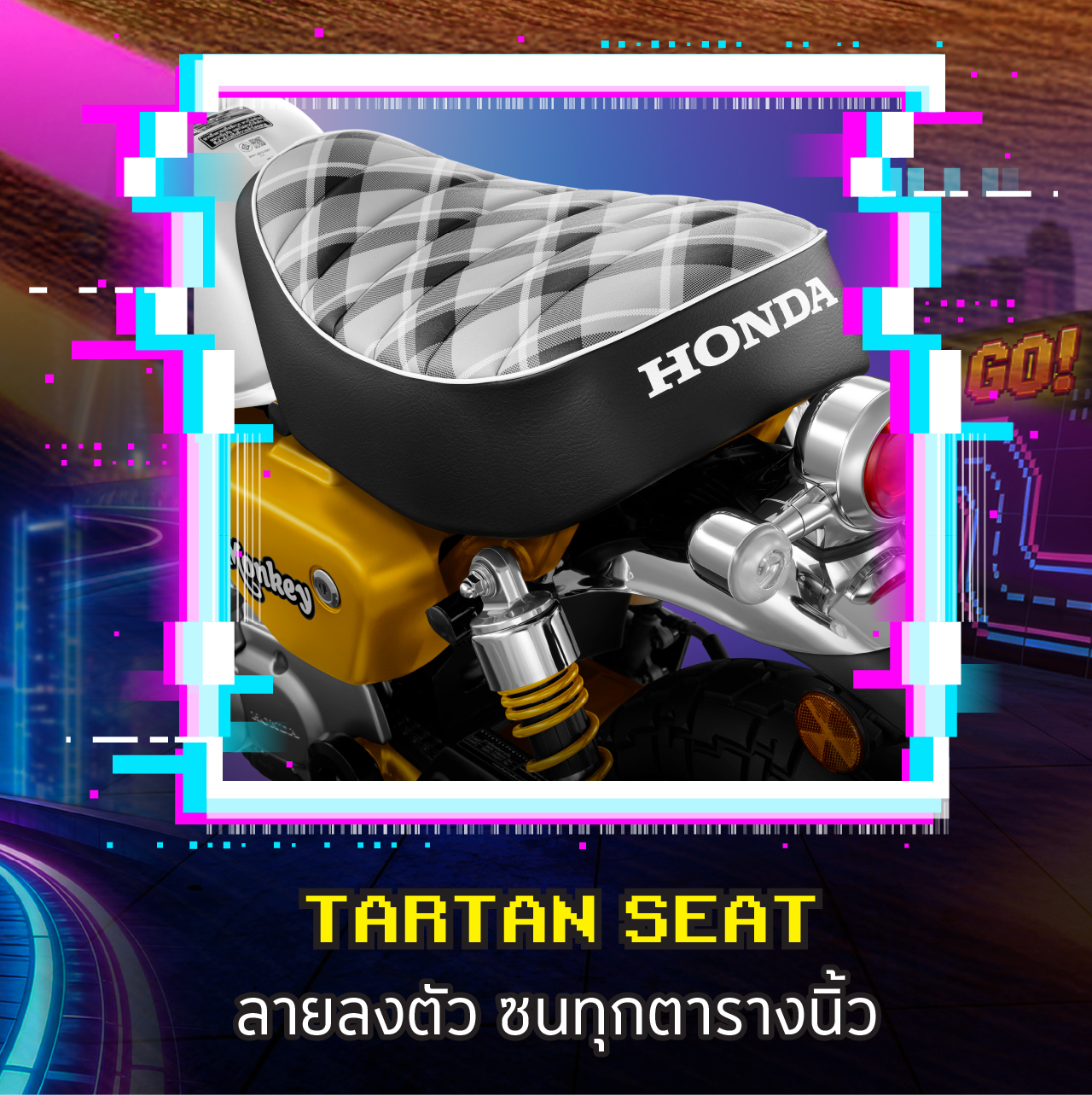 Jok bermotif tartan tetap dipertahankan untuk menonjolkan nuansa retro, berpadu dengan panel meter digital yang kini lebih modern dan mudah dibaca. Lampu depan bulat Origin yang ikonik juga masih menjadi identitas utama Honda Monkey.