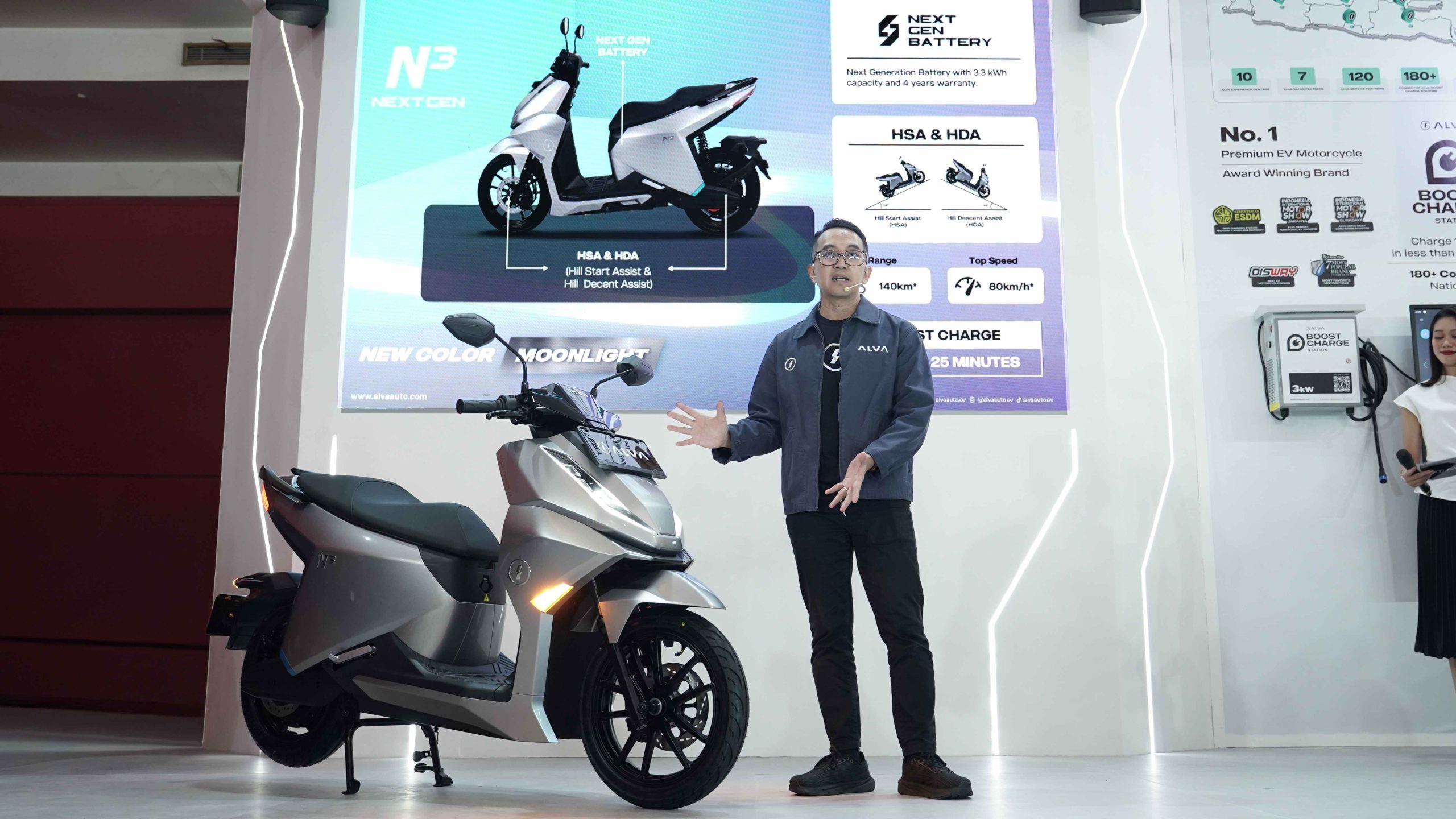 Untuk mendukung kenyamanan dan keamanan berkendara, ALVA N3 Next Gen telah dilengkapi fitur Hill Start Assist (HSA) dan Hill Descent Assist (HDA), yang membantu pengendara saat melintasi jalan menanjak maupun menurun. Motor listrik ini juga hadir dengan pilihan warna baru Moonlight Silver, yang memberikan tampilan lebih modern dan premium.