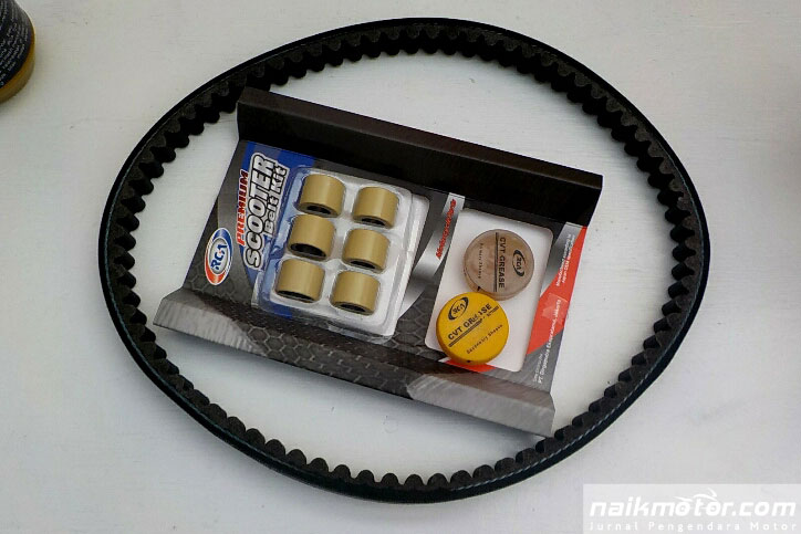 Produk berikutnya adalah cvt belt kit berisi belt, roller dan belt grease. Produk diperuntukkan untuk skuter matik produk bermerek Jepang. Harga yang ditawarkan Rp 90-100 ribu. (Afid/nm)