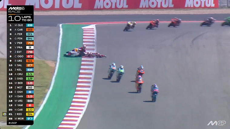 Situasi semakin buruk ketika motornya yang melintang di lintasan ditabrak oleh Joel Esteban. Insiden tersebut membuat keduanya tidak bisa melanjutkan balapan.