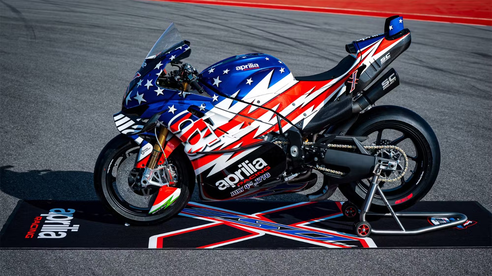 Motor superbike berbasis RSV4 1100 Factory ini memiliki spesifikasi balap dan tampilan khas bintang serta garis ala Amerika Serikat.