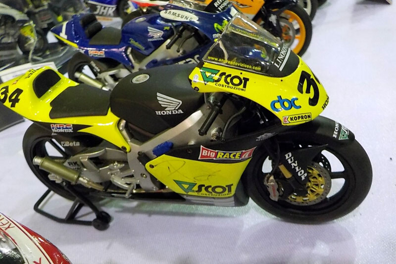 modeller_motor_diecast_1Seperti 3 koleksi milik Fandi Nashidhin, salah satu anggota IMD, dengan model skala 1:12, Honda Moto2 250 cc no#34 yang dikendarai Andrea Dovizioso saat tergabung Team Scot Honda. Sepeda motor balap Honda 250cc no 34 itu menjadi bersejarah sebab membuat Dovizioso mendapat gelar Rookie of The Year Moto2 2005, dengan 5 kali podium dan dalam juara ketiga tingkat dunia.