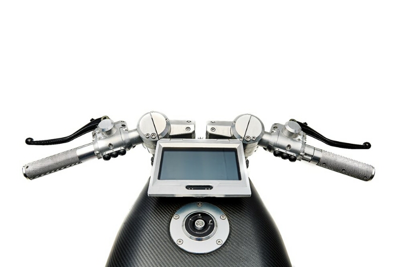 Sedangkan separuh bagian atas berupa platform aluminium yang datar bertumpu pada bagian atas head silinder. Di atas platform ditempatkan tangki karbon 21 liter yang seperti menyatu dengan jok tipisnya.