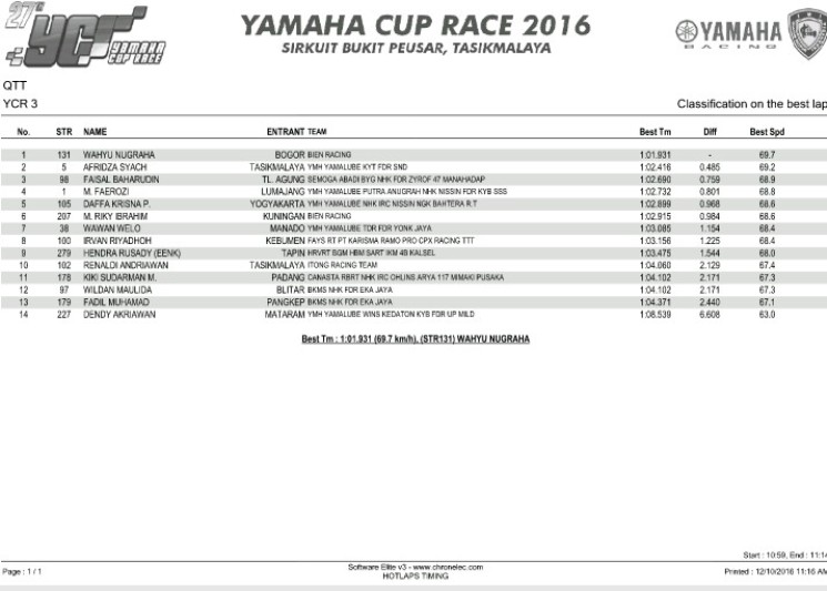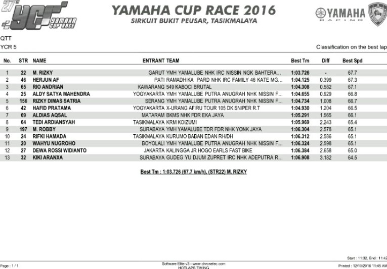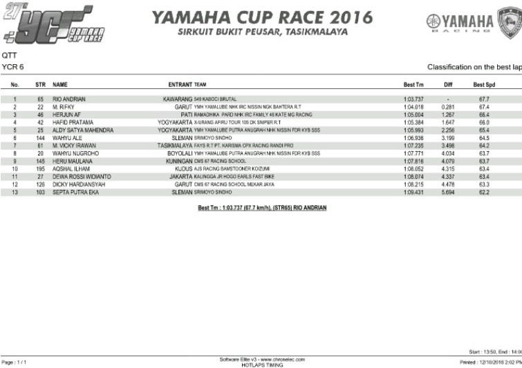 NaikMotor – Para peserta Yamaha Cup Race (YCR) 2016 seri tiga telah memercikkan persaingan sengit sejak sesi kualifikasi, Sabtu (10/12/2016). Tidak ada pembalap yang bisa mendominasi, khususnya di kelas seeded.