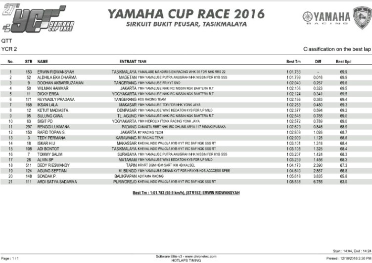 Sementara itu, pembalap tim Yamalube Mandiri Bien Racing WHK 35 FDR NHK RRS 22, Erwin Ridwansyah memberi kejutan dengan membuat waktu lap tercepat di sesi kualifikasi YCR 2. Pembalap yang baru pertama kali merasakan persaingan di kelas seeded itu tampil apik hingga berhasil memngungguli pembalap-pembalap unggulan seperti duet Yamaha Yamalube NHK IRC Nissin NGK Bahtera, Wilman Hammar dan Dicky Ersa.