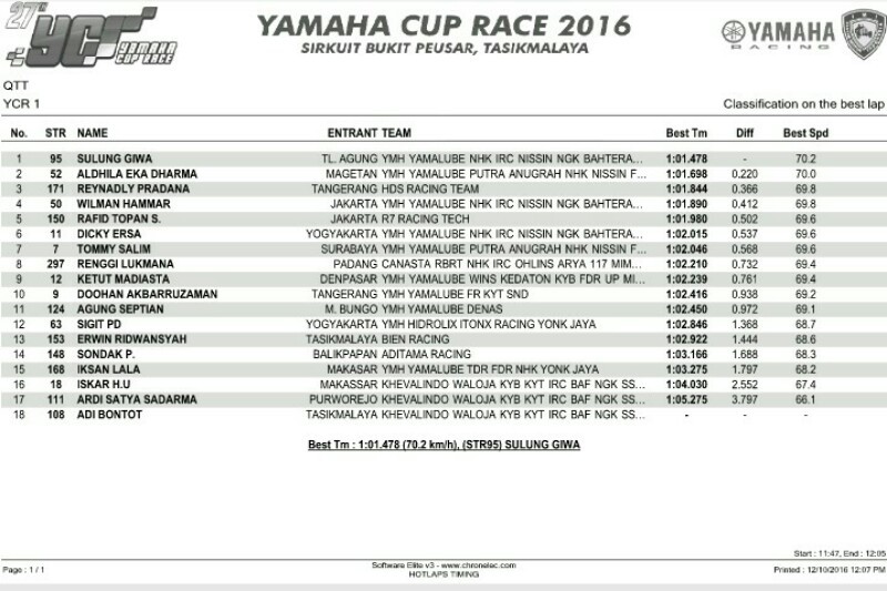 Sulung Giwa yang penampilannya terbilang konsisten di YCR 2016 berhasil mengunci posisi start terdepan YCR 1, setelah membukukan waktu lap tercepat 1 menit 01,478 detik. Aldhila Eka Dharma dan Reynaldy Pradana membuntuti di posisi start kedua dan ketiga.
