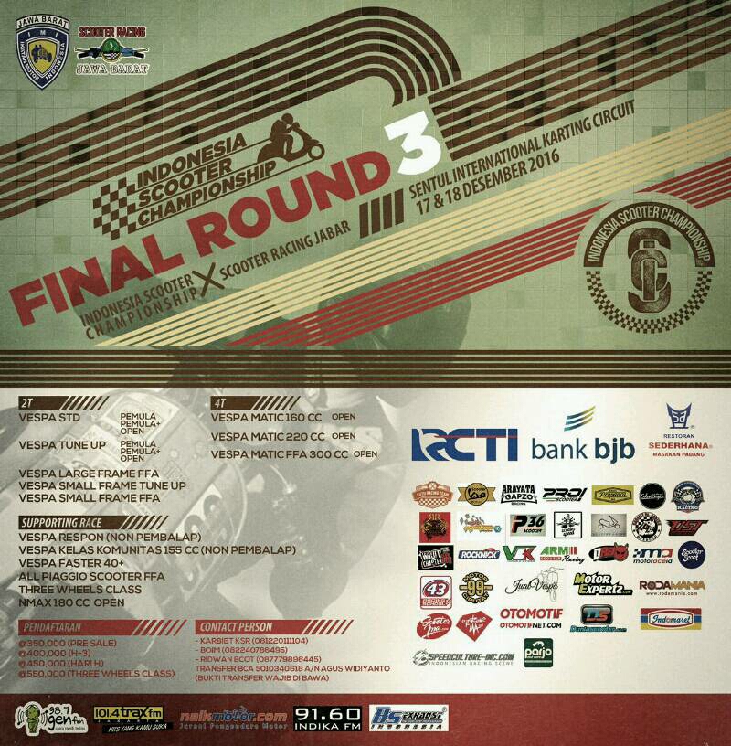 NaikMotor – Putaran final Indonesia Scooter Championship (ISC) 2016 akan berlangsung 17-18 Desember 2016 di Sirkuit Karting Sentul, Jawa Barat. Tentunya kemeriahan balap skuter, baik produk Italia maupun skuter matik lainnya itu sudah ditunggu oleh para pembalap dan penonton setianya.