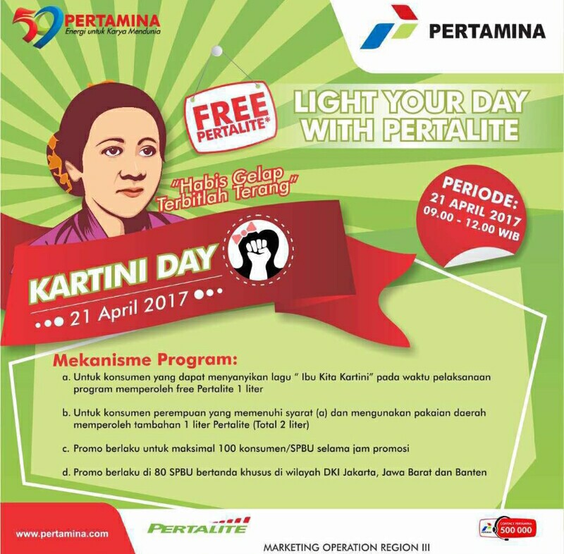 b. Dipertuntukan untuk konsumen pria maupun wanita yang dapat menyanyikan lagu “Ibu Kita Kartini” pada waktu pelaksanaan program akan mendapatkan free Pertalite 1 liter. Selain itu, jika konsumen wanita juga mengenakan pakaian daerah akan mendapatkan tambahan 1 liter Pertalite (total 2 liter/konsumen). Promo berlaku untuk maksimal 100 konsumen/ SPBU selama waktu promosi.
