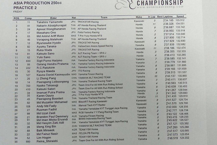 Di FP2 AP250cc, duel tim Trickstar (Kawasaki) versus AP Honda Racing Thailand tidak terbantahkan lagi. Sementara trio pembalap Yamaha Factory Racing Indonesia berada di urutan 12 (Sigit PD), 13 (Galang Hendra) dan 14 (Rey Ratukore).